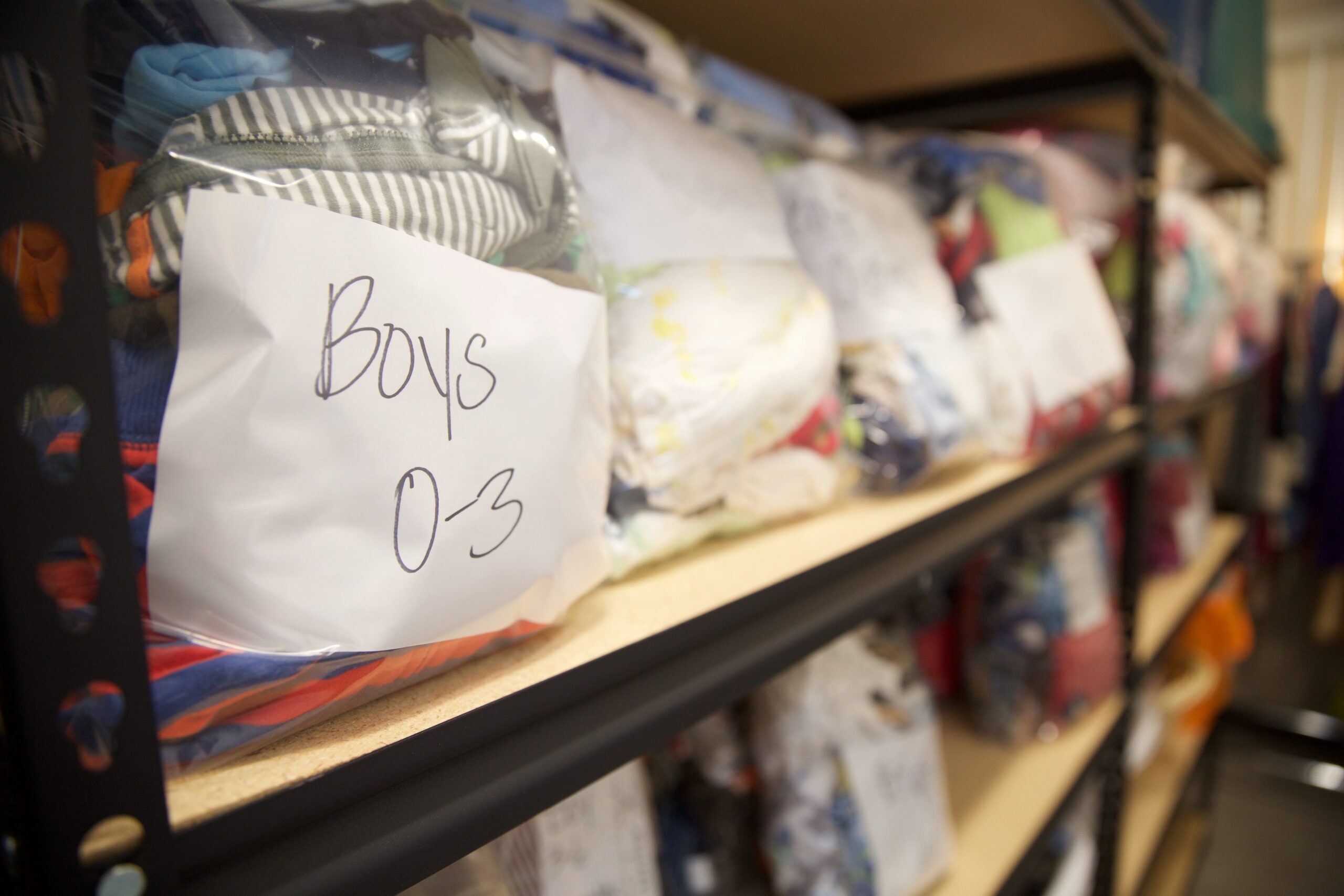 Clothing and other items on the shelves of a NIFLA-affiliated pregnancy center in El Cajon, California, provided to women and their children free of charge.